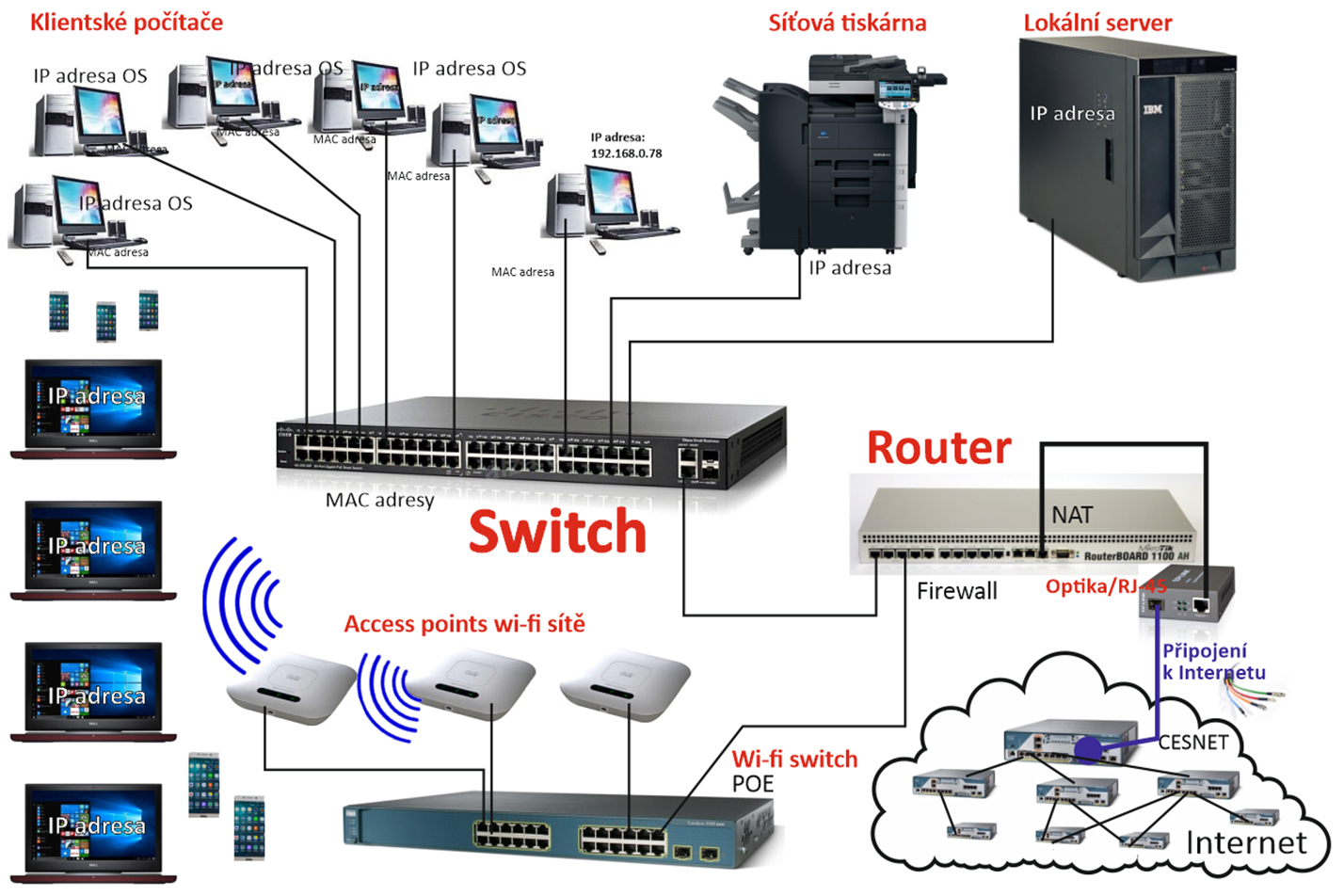 - switch = přepínač paketů uvnitř jedné LAN