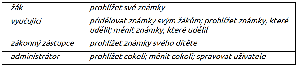 11. Ve dvojicích si rozmyslete, jaký typ uživatelů by se měl přihlašovat do elektronické ŽK. Vytvořte seznam těchto uživatelských rolí. Do seznamu také sepište všechny činnosti, které by měl uživatel v systému dělat.