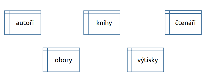 12. Databáze. Šipkami propojte jednotlivé tabulky knihovní databáze. Jaký vztah k sobě tyto tabulky mají a kolik prvků mohou šipky mezi tabulkami propojit?